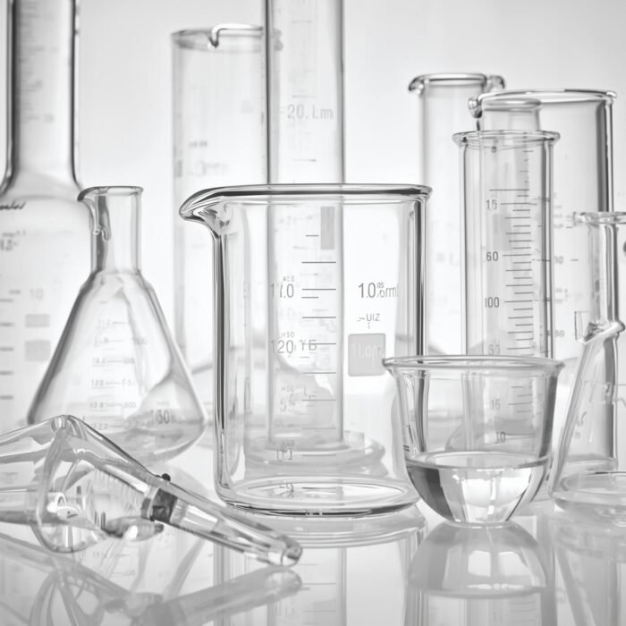 Erlenmeyer, Florence, and volumetric flasks for precise measurements.